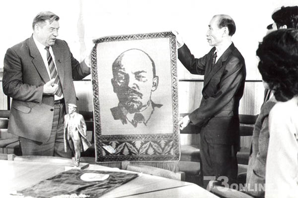 Вручение 1-ым секретарем Ульяновского обкома КПСС Геннадием Васильевичем Колбиным памятного подарка представителю Корейской делегации.27 июня 1986 г.