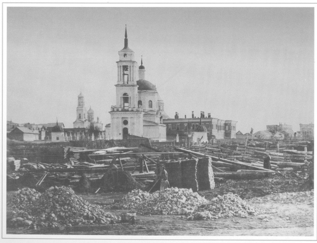 Симбирск возрождается после пожара. Снимок 1865 года: на Большой Саратовской улице – груды строительных материалов, отреставрированная Троицкая церковь, за нею – остов сгоревшего каменного дома без крыши