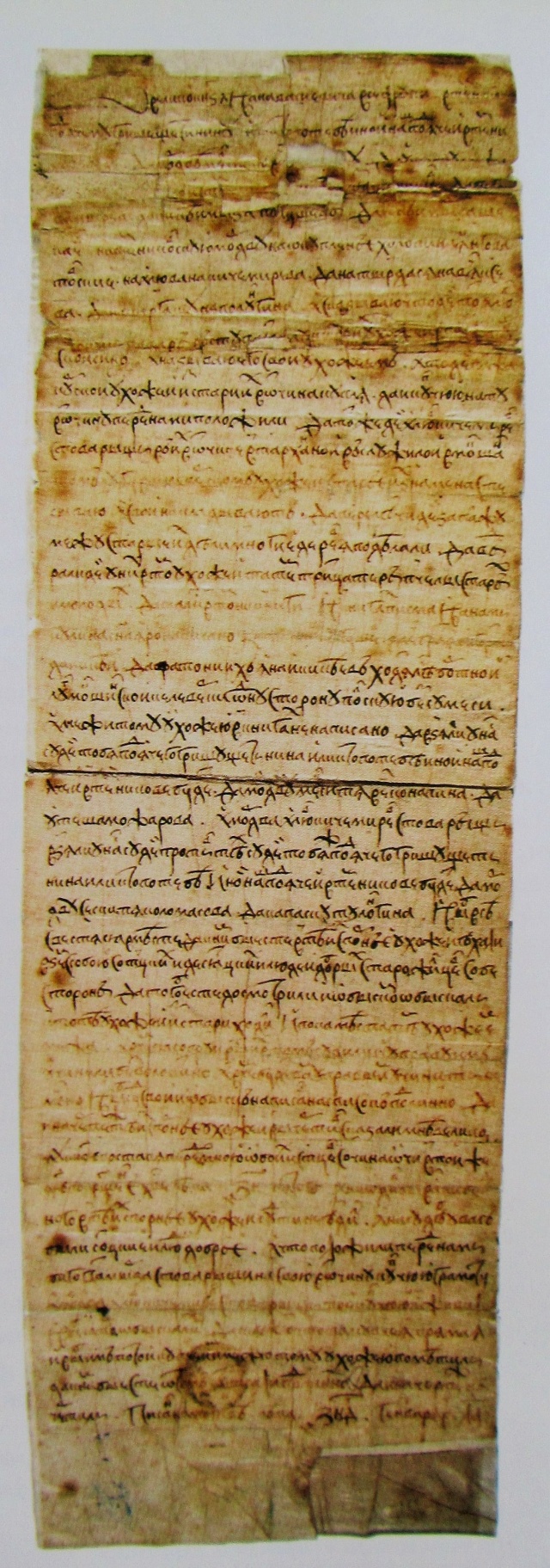 Древняя грамота представляет собой свиток, или столбец, как говорили в допетровскую старину. Документы в деле и листы в документе не сшивались в тетрадь, а подклеивались снизу к друг другу, иногда достигая длины на многие десятки, а то и сотни метров. Конечно, работать с такой документацией было крайне неудобно – зато столбцовое делопроизводство практически исключало подлог документов в деле. Европеизируя Россию, царь-реформатор Петр I ликвидировал столбцы, хотя и не сразу – и именно на столбце записан один из первых «европейских» указов царя от 20 декабря 1699 года о праздновании Нового года с 1 января 1700 года.