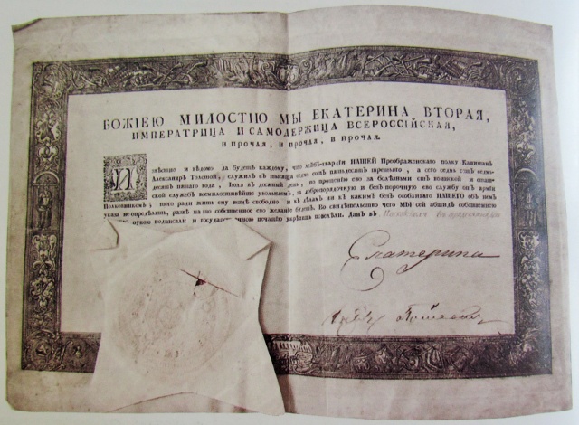 Увольнительное свидетельство капитана лейб-гвардии Преображенского полка Александра Толстого от 30 июля 1775 года также подписано императрицей Екатериной II и ее фаворитом и тайным мужем графом Григорием Потемкиным. 13 июля 1775 года у пары родилась дочь Елизавета, получившая фамилию Темкиной – так, отсекая первый слог отцовской фамилии, прозывали незаконных отпрысков знатных особ; так что автографы ставились на фоне семейной идиллии. А вот у офицера-гвардейца Александра Толстого отношения с графом Потемкиным, с «самым влиятельным лицом в России», которого любящая императрица назначила командовать самым старым и заслуженным гвардейским полком, не сложились, и он вынужден был уйти в отставку и уехать в свои симбирские имения. При Павле I, в 1797–1799 годах Александр Толстой служил Симбирским губернатором…