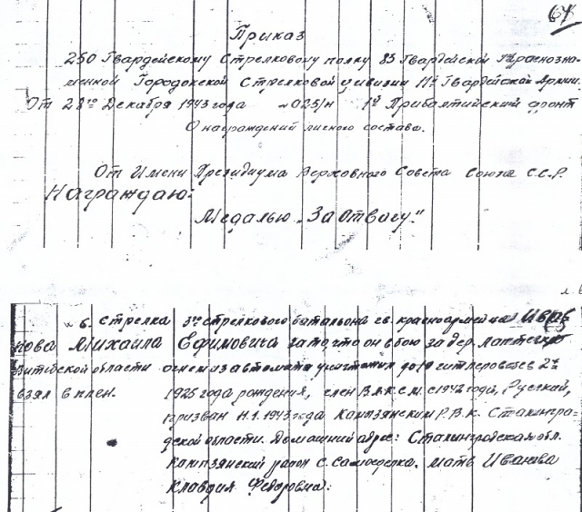 О боевых делах в Белоруссии рядового Иванова свидетельствуют документальные материалы центрального архива Министерства обороны России. В частности приказы по 250-му гвардейскому полку 83-ей гвардейской стрелковой дивизии № 023/Н от 21 декабря и №025/Н от 28 декабря 1943 года. В первом, о награждении личного состава от имени президиума Верховного Совета Союза ССР «Орденом Славы» III степени, сказано: «21 декабря 1943 г. гвардии рядовой 250-го стрелкового полка, автоматчик Иванов М.Е. участвовал в штурме сильно укрепленной гитлеровцами высоты 203,6 на подступах к райцентру Городок Витебской области, под ураганным пулеметным и минометным огнем противника в числе первых бойцов ворвался во вражеские окопы и уничтожил 4-х фашистов…». Во втором приказе, где он представлен к награждению медалью «За отвагу» написано: «Стрелок 3-го стрелкового батальона 250-го стрелкового полка гвардии красноармеец Иванов Михаил Ефимович в бою за деревню Лаптевка Витебской области огнем из автомата уничтожил до 10 гитлеровцев, двоих взял в плен, несмотря на то, что был ранен».