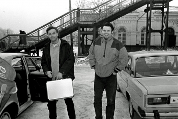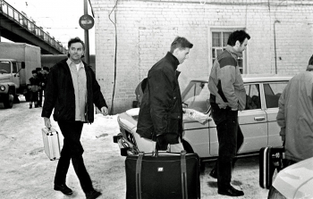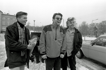 Группа «JOY» (Австрия). Встреча в городе Инза Ульяновской области. Музыканты вышли с поезда и на машинах доехали до Ульяновска, где дали концерт в КДЦМ (ныне - ДК "Губернаторский") по приглашению УлГУ. Первые два кадра сделаны в Инзе, третий у гостиницы Октябрьская в Ульяновске)