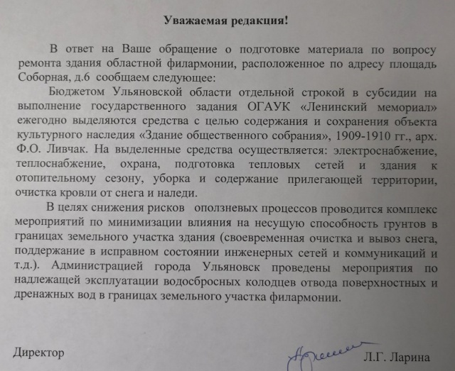 Наши вопросы: “Когда будут проведены берегоукрепительные работы в районе Ульяновской филармонии? Когда будет продолжен ремонт здания? Какие средства в бюджете (минкульта, городском, областном или федеральном) на это выделены? В каком виде здание филармонии предстанет перед гостями города на праздновании 150-летия Ленина? Планируется ли к этой дате провести хотя бы внешний косметический ремонт?”