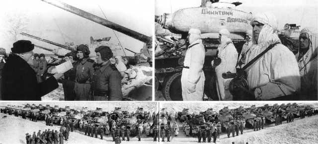 Передача 38-му и 516-му полкам танковой колонны «Дмитрий Донской», построенной на средства, собранные верующими по призыву митрополита Сергия. От РПЦ в церемонии участвовал митрополит Крутицкий и Коломенский Николай (Ярушевич)