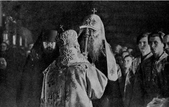 Вручение жезла новопоставленному патриарху Московскому и всея Руси Сергию. Москва, Богоявленский кафедральный собор, 12 сентября 1943 года