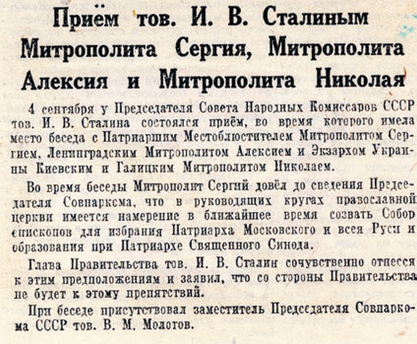 Главный итог этой встречи - Советская власть признала за церковью право на существование. Был учрежден даже отдел по делам религии (естественно, в структуре НКВД). Было принято ещё одно значительное для русской религиозной истории решение: Сталин свернул эксперимент с обновленцами, просто ликвидировав их структуру. Иерархи-обновленцы вскоре один за другим начали каяться за участие в расколе и возвращаться в лоно традиционной церкви.