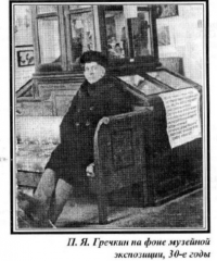 Впервые фамилию Гречкина я услышала от старейшего сотрудника нашего краеведческого музея О.В. Рождественского в 1957 году. В экспозиционном зале он шепотом, взволнованно рассказывал мне, каким прекрасным человеком и специалистом был первый директор краеведческого музея Павел Яковлевич Гречкин и каким интересным был в то время музей.