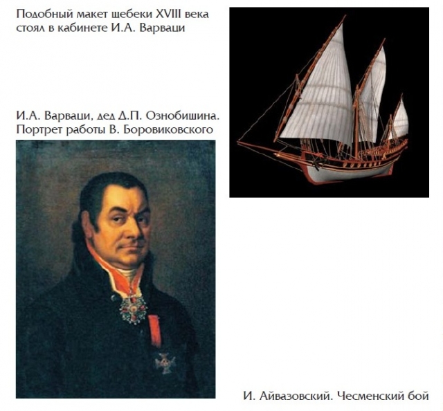 Дети Ознобишины любили гостить у деда в Астрахани. Заветным местом в огромном доме был его рабочий кабинет, где на пушистом персидском ковре стоял большой макет военного корабля Варваци! При всей своей занятости Иван Андреевич находил время и для внуков. Со стен снимались шашки, и бросался жребий, кто будет воевать за Грецию, Турцию и Россию. Дед ставил условие, что игра состоится, если «турком он не будет». И начинался бой. Остановить его могла только няня Денисьевна. Она неслышно «вплывала» в кабинет, вставала на бархатный красный диван, и, размахивая Андреевским флагом, который вынимала из флагштока, кричала грудным голосом: «Победа русского флота! Ура! Славных моряков просят отобедать».