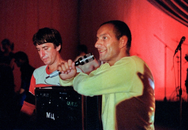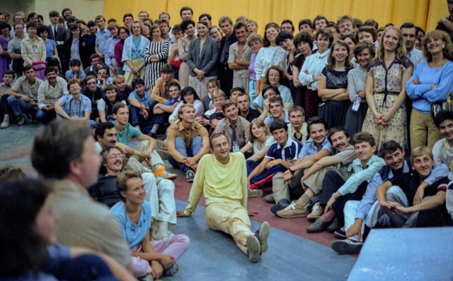 Выступление труппы Вячеслава Полунина в спортзале дворца Профсоюзов. Вячеслав Полунин сидит на полу в жёлтом (гость фестиваля). Это выступление не входило в программу фестиваля: