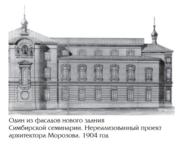 С конца XIX столетия в Симбирск для осмотра построек местной семинарии неоднократно приезжал по заданию Синода архитектор Морозов. Перед ним стояла задача выяснить, нельзя ли ещё каким-то образом увеличить площадь помещений этого учебного заведения. Однако Морозов пришёл к выводу, что никакие дополнительные пристрои не могли исправить одного из наиболее существенных недостатков семинарского комплекса – его размещение на одной из самых оживлённых торговых улиц города – Большой Саратовской.