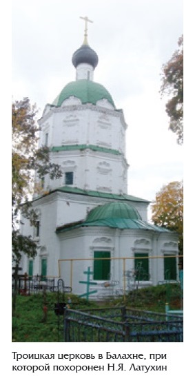 Участник войн с Наполеоном – в Пруссии (при Прейсиш-Эйлау), в Финляндии – русско-шведская война (1808–1809), а впоследствии – начальник отделения в Инспекторском Департаменте Главного штаба, Николай Яковлевич Латухин сделал не только военную карьеру. С 1818-го по 1825 год он был балахнинским уездным судьей, с 1834-го по 1841-й – уездным предводителем дворянства, владел постоялым двором, стекольным и солеваренным заводами. В 1840-х годах солеварением занимались лишь купцы Редозубовы, которые арендовали рассолы у Н.Я. Латухина, а в начале 50-х годов производство стало невыгодным и прекратилось. Правда, сам Николай Яковлевич не застал окончательного упадка соляного промысла в Балахне: 12 июня 1843 года он умер и был похоронен на балахнинском кладбище при Троицкой церкви.