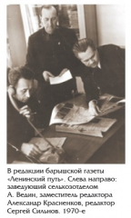 Начал работать корреспондентом в отделе промышленности. Моим непосредственным начальником был заместитель редактора Александр Иванович Красненков. Он, как правило, планировал материалы на все четыре номера. В понедельник редактор Сергей Дмитриевич Сильнов с утра отправлялся в райком партии. В этот день там собирались члены бюро райкома и горкома. В тот период в Барыше было два партийных органа – сельскохозяйственный партком и промышленный горком. Первый возглавлял Никита Михайлович Вирясов, а второй – Владимир Егорович Слываков. Рабочий расклад наш был таков: примерно одна командировка в две недели на предприятие за пределами Барышского района. К примеру, на Инзенский диатомовый комбинат, Глотовский деревоперерабатывающий завод, Славкинский древкомбинат Николаевского района, Шарловский трепельный завод Вешкаймского района, Кузоватовскую мебельную фабрику, Матютинский спиртзавод, Базарносызганский леспромхоз. В нашем Барышском районе командировки проще. Утром, скажем, съездил на Старотимошкинскую суконную фабрику, а во второй половине дня – на Жадовский литейно- механический завод. Взял необходимый для газеты материал и к ужину домой возвратился. <...>