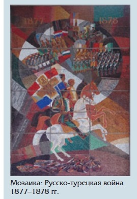 На одной стороне парадного двора размещены четыре мозаики, посвящённые Болгарии. Каждое мозаичное панно имеет два художественных плана: центральный рисунок – на фоне изображения в круге. На первой мозаике изображены создатели славянской азбуки святые равноапостольные братья Кирилл и Мефодий, на фоне алфавита. На второй – воины болгарского ополчения с Самарским знаменем в русско-турецкой войне 1877–1878 годов, на фоне российских и союзных войск балканских государств. Благодаря сохранившимся в фондах научно-культурного центра эскизам к мозаикам, известны авторские названия следующих «болгарских» мозаик: «Освобождение Болгарии 1944 г. сентябрь» и «Гостеприимная земля».