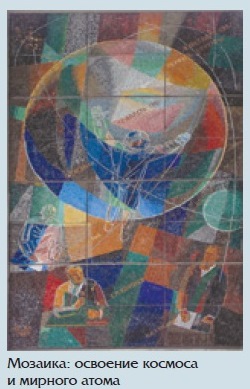 На противоположной стороне парадного двора расположены четыре мозаичных панно, отражающие вехи истории СССР. Первое посвящено Октябрьской революции 1917 года. Второе – первым годам советской власти, становлению советского государства. Третья мозаика была названа художниками просто: «Победа. 1941–1945 гг.». На четвёртой мозаике, посвящённой освоению космоса и мирного атома, изображены Константин Циолковский, Сергей Королёв, Игорь Курчатов и Юрий Гагарин.
