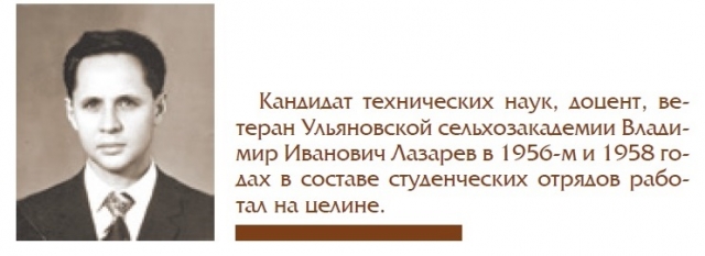 Летом 1956 года мы окончили первый курс факультета механизации. После летней сессии нас собрали в актовом зале второго корпуса. Приехал какой-то важный человек из областного начальства и стал нам говорить о нашем долге перед Родиной, о том, что мы должны поехать на уборку целинного урожая.