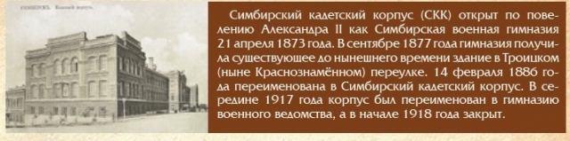 Он назвал её «Честь». Отрывки этой книги, а также статья о загадочной личности её автора были размещены на страницах журнала «Мономах» несколько лет назад. Фотографии, которые сегодня публикуются впервые, позволяют представить повседневный быт симбирских кадет и наполнить историю Симбирского кадетского корпуса живыми, реальными образами.