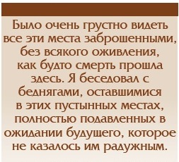 Было очень грустно видеть все эти места заброшенными, без всякого оживления, как будто смерть прошла здесь. Я беседовал с беднягами, оставшимися в этих пустынных местах, полностью подавленных в ожидании будущего, которое не казалось им радужным.