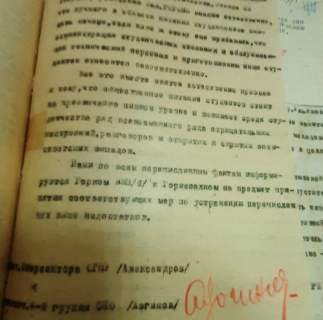 “Питание в студенческой столовой, по словам студентов, отвратительное, кормят, как они выражаются, гнилым силосом, нередко вынимают из тарелки червяков, не доваривают, в лёгкое ткнёшь вилкой, а оно на полметра прыгнет вверх, пообедаешь и еле-еле ноги волочишь до койки и снова отдыхать. В интернате нет кипятка, в столовой тоже случается часто, что не дают чая, нет кипяченной воды, а вместо чая, за неимением сахара, дают утром противных помидор. Обед в последнюю десятидневку готовят такой, что несмотря на голод студенты от него отказываются, берут только хлеб и из столовой уходят… Студенты жалуются на следующее обстоятельство: обед стоит 60 копеек, а вместо него выдается 700 грамм хлеба, который стоит 10-12 копеек. Это обстоятельство, связанное одновременно с холодом в общежитии, ведёт студентов к преступлениям, о которых со стыдом и откровенностью говорят сами студенты. Так, например, студенты рабфака целой группой ходят воровать дрова, до начала операции по похищению дров распределяя роли”.