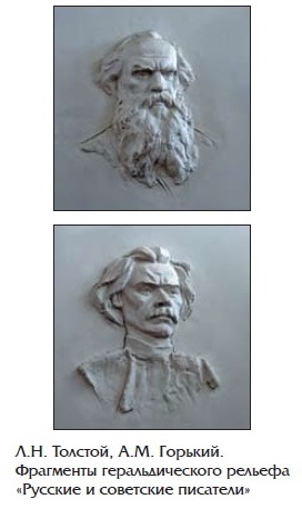Геральдический гипсовый рельеф «Русские и советские писатели» (авторы С.В. Бобраков, А.И. Клюев), размещённый в аванзале, задаёт понимание Пушкина и Языкова в традиции освободительного движения в России и связи писателей с народом. В галерее поэтов и писателей нет не только Карамзина, но и Гончарова.