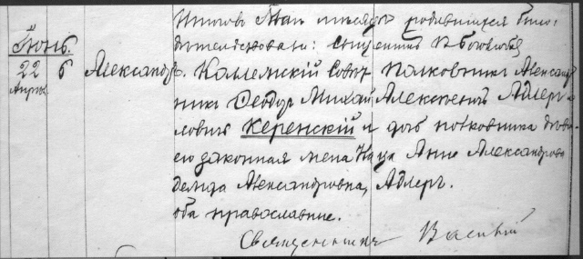 Однако назвали мальчика Сашей не в честь дяди, а в честь деда, обрусевшего немца, служившего начальником Казанского топографического бюро полковника Александра Алексеевича Адлера. Он стал крестным отцом внука, окрещенного не у дяди, а в Тихвинской церкви города Симбирска 6 (18) июня 1881 года. Кажется, это была рекордная задержка между рождением и крещением ребёнка православного вероисповедания в дореволюционном Симбирске – юного Володю Ульянова крестили уже на седьмой день. Одного этого факта было достаточно, чтобы Керенский-старший прослыл в Симбирске ниспровергателем основ!..