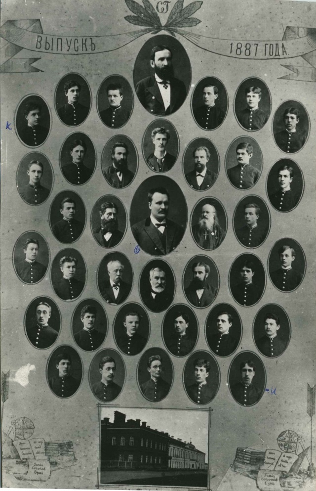 Выпускная фотография класса Владимира Ульянова, 1887 год. В центре - директор Ф.М. Керенский. В. Ульянов - третий слева во втором ряду снизу