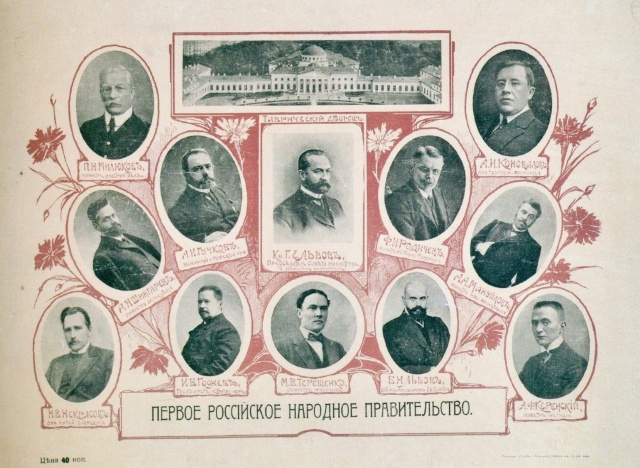 Плакат «ПЕРВОЕ РОССИЙСКОЕ НАРОДНОЕ ПРАВИТЕЛЬСТВО», март 1917 года. Александр Керенский - крайний справа в нижнем ряду