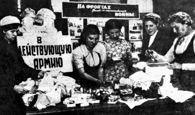 Работницы завода имени Володарского собирают подарки для фронта. Октябрь 1941 года