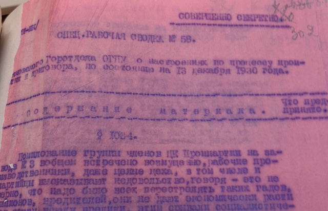 "На состоявшемся пленуме Заволжского Продрайкома ВКП (б) 10/XII-30 г. одним б/п рабочим был задан вопрос, а нет ли у нас вредительства во ВЦИКе, в связи с тем, что во вредительской организации замечены члены ЦИК СССР".
