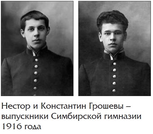 Братья Константин и Нестор Грошевы ровно 100 лет назад, весной 1916 года, получили аттестаты зрелости из рук директора гимназии В.П. Андроникова. Это был юбилейный, 100-й выпуск гимназии. За плечами 44 юношей остался большой трудный период их жизни – восемь лет они «грызли гранит науки». У братьев Грошевых он ещё сопровождался и воспоминаниями о том, как непросто им было поступить сюда. Дело было в том, что Константин на момент поступления в гимназию был старше 12 лет. Согласно существующим правилам таким детям полагалось отказывать. Поэтому в 1908 году их отцу стоило большого труда убедить директора Симбирской классической гимназии Некрасова принять обоих своих сыновей в учебное заведение. Он даже писал прошение на имя господина попечителя в канцелярию Казанского учебного округа, и в результате ситуация благополучно разрешилась.