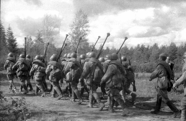 Красноармейцы в шинельных скатках выдвигаются к полю боя