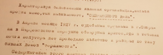 «В апреле месяце 1927 года судебными органами в городе Сызрани, в Парфеновском переулке, обнаружен притон, где в течение почти полутора лет проходило пьянство и разврат по типу бывших домов «терпимости».
