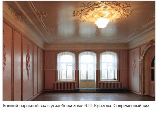 Внешнему виду дома соответствовало его внутреннее убранство: богатая лепнина на потолке с неповторимыми для каждой комнаты сюжетами, камины с кафельной облицовкой и ажурной лепной отделкой, филёнчатые двери с вставками из бука и граба, инкрустированный паркетный пол. Строился дом десять лет и, по слухам, обошёлся Крылову более чем в сто тысяч рублей. Вокруг дома был разбит парк с аллеями и прудом.