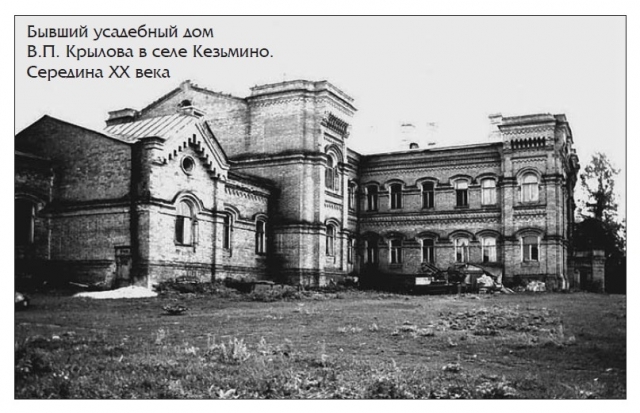 Сам же Крылов, поселившись вместе с женой в приобретённом имении, где за ним, кроме суконной фабрики, числилось более трёх тысяч десятин земли, с купеческим размахом приступил к воплощению своей давней мечты – сделаться «барином». Не жалея средств, выстроил внушительных размеров двухэтажный господский дом-дворец с пристроенной к нему водонапорной башней, видом напоминающий средневековые европейские замки. Автор проекта гражданский инженер В.Н. Брюхатов учёл все пожелания заказчика, сочетая разные архитектурные замковые стили XVI–XVII веков, элементы пышного барокко и русского стиля в каменной резьбе. «Величественно и массивно выглядит встречающий посетителя парадный вход с балконом, ограждение которого изготовлено из кузнечного литья причудливой формы».