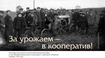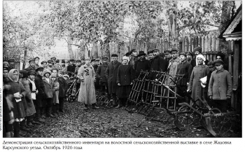 Развитие всех видов кооперации сопровождалось ростом обеспеченности их различными орудиями производства. Особенности ведения полевых работ в Карсунском уезде и конкретно в Жадовском районе (возделывание так называемых интенсивных культур – картофеля, бобовых, конопли и других) предопределили необходимость роста оснащённости карсунских кооперативов крупной сельскохозяйственной техникой. В отчётном докладе на XVIII уездной партийной конференции показана динамика роста обеспеченности сельского хозяйства Карсунского уезда машинами и инвентарём: к 1926 году плугов здесь насчитывалось 11211 штук, сеялок – 423, жнеек – 181, молотилок – 509, веялок – 1059, тракторов – 11. Прямым свидетельством тому служит фото № 2, запечатлевшее выставку разнообразного инвентаря на сельскохозяйственной ярмарке.