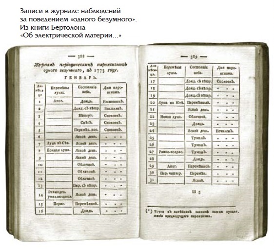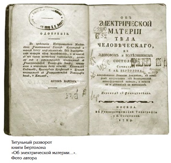 Отметим, что конец XVIII века – время увлечения электричеством. Аббат Бертолон размышлял об электрической материи, находящейся в атмосфере и в человеческом теле, о влиянии её на человека, давал читателю рекомендации «как электризовать недостатком, или отрицательно, и электризовать избытком, или положительно».
