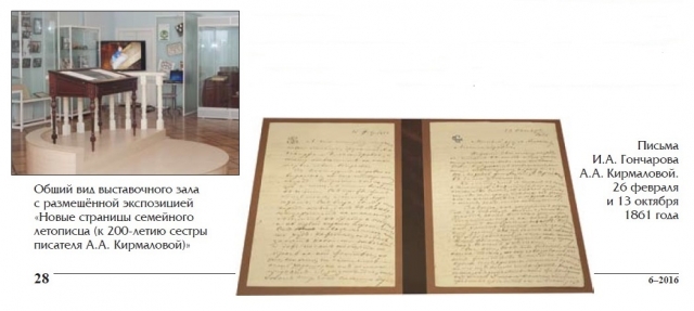 В преддверии 205-летия со дня рождения И.А. Гончарова хотелось бы вспомнить об одном не менее значимом для почитателей творчества прославленного романиста и профессиональных гончарововедов юбилее. В честь 200-летия сестры писателя А.А. Кирмаловой в рамках Года литературы в Российской Федерации и Года национальной памяти и славы в Ульяновской области в музее И.А. Гончарова была создана выставка «Новые страницы семейного летописца».