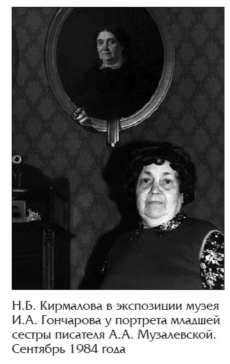 Нина Борисовна Кирмалова (1913–1990) – старшая дочь Бориса Владимировича Кирмалова, старшего сына племянника И.А. Гончарова Владимира Михайловича Кирмалова – побывала в Ульяновске дважды (в 1984-м и 1985 годах). Она передала в дар музею фотографии своего деда, его жены Александры Глебовны (в девичестве – Персениновой) и детей – Бориса, Анатолия и Павла, а также японские полочки, привезённые И.А. Гончаровым из путешествия на фрегате «Паллада» и подаренные племяннику Владимиру Михайловичу.