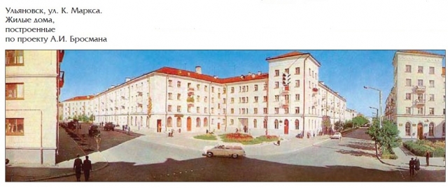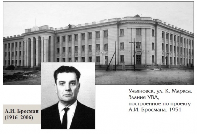 За эти годы была проведена полная архитектурно-строительная, транспортно-строительная и инженерно-техническая реконструкция всей центральной части Ульяновска. Александр Иванович – автор проекта административного здания областного УВД и прилегающих к нему жилых домов по обе стороны от улицы Гагарина до улицы Марата, проекта планировки северной части города, реализованного в 1950-е, пристроя поликлиники и клуба к зданию КГБ на улице Л. Толстого, многоквартирного жилого дома с клубом приборостроительного завода. Кстати, впервые в истории города при А.И. Бросмане введена должность городского художника.