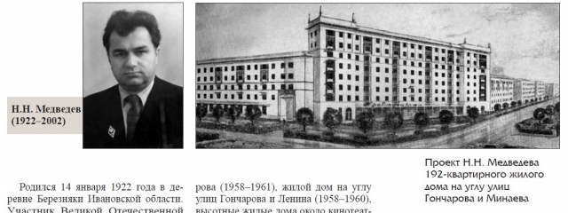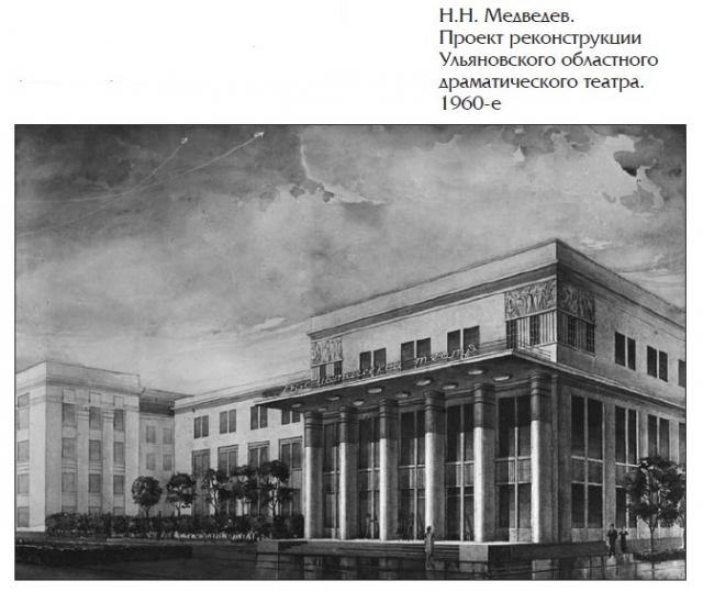 С 1971-го по 1978 год – главный архитектор Ульяновска. Дважды, в 1965–1971 и 1978–1985 годах, Н.Н. Медведев занимал должность начальника Ульяновского областного отдела по делам архитектуры и строительства – главного архитектора Ульяновской области. По проектам Н.Н. Медведева в Ульяновске и Ульяновской области построены: областной драматический театр (1963–1965), здание гостиницы «Советская» (1967–1969), жилой дом на углу улиц Гончарова и Минаева (1961–1964), жилой дом на ул. Гончарова (1958–1961), жилой дом на углу улиц Гончарова и Ленина (1958–1960), высотные жилые дома около кинотеатра «Рассвет» (1958–1960), детская инфекционная больница в северной части Ульяновска (1954–1956).
