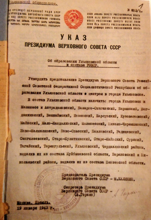 Именно 18 февраля 1943 года увидел свет первый номер областной газеты «Ульяновская правда», в которой был обнародован указ от 19 января 1943 года об образовании Ульяновской области, а 15 марта заговорило областное радио. Наконец, 26 марта 1943 года были утверждены «штаты областных организаций по Ульяновской области, состоящих на местном бюджете, в количестве 452 единиц с месячным фондом заработной платы 246 945 рублей».