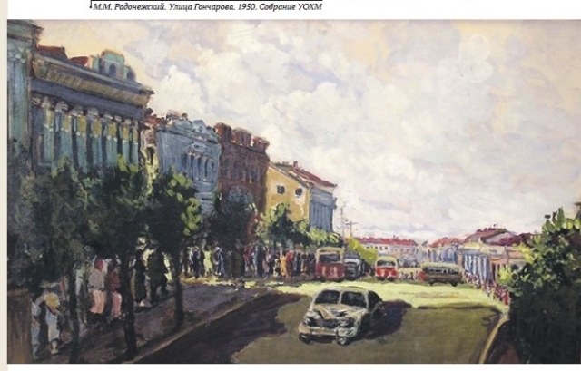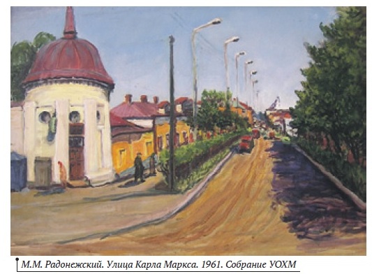 В образе города мирно уживались «новые движения жизни» и обаяние старой архитектуры. В основе пейзажей М.М. Радонежского главным оставалась гармония вечного содружества. Он любил подчеркнуть перспективу уходящей вдаль улицы (часто это был деликатный уход вглубь композиции картины). Он передавал движение, создаваемое автомобилями на дорогах и фигурами редких прохожих.