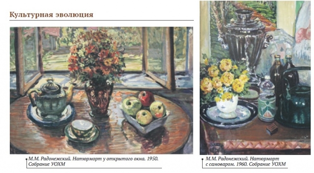 Если пейзаж диктовал определенные правила в обозначении конкретного места, то натюрморт спешил уверить прежде всего в декоративном первородстве всех предметов: цветов, чашек, ваз, самоваров, различной снеди. Художественная чуткость мастера давала возможность соединить в органическую цветовую логику предельную вещественность и декоративную структуру интимного мира чувств. Радонежский нередко писал натюрморты у открытого окна, запуская воздушные ритмы в тихое мироощущение пространства интерьера. Образная составляющая словно бы базировалась на большей «аккуратности» живописного мазка. «Бархат» цветов и их же беззащитная прозрачность, контраст отблесков холодного стекла бутыли и обжигающего жаром самовара, историческая суть старинного фарфора в современном интерьере – все создает емкий энергетический посыл в рамках «тихого» жанра. Художник чувствует себя свободным в игре, которую неизменно создают предметы. Эта игра включает традиции старого натюрморта, который элегантно, но все-таки наталкивается на новаторство искусства начала ХХ столетия. Она ощущается в живописи густого по фактуре, корпусного натюрморта советского искусства. При всей конкретности в выборе объектов это зримое, осязаемое место, время, окруженное предметами – рассказчиками, в котором способно меняться только настроение.