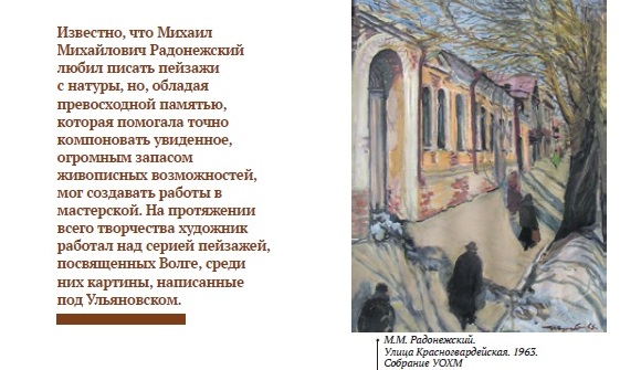 В 1931 году по приглашению Городского отдела народного образования художник переехал в Ульяновск, который стал его второй родиной. Именно здесь раскрылся талант М.М. Радонежского – пейзажиста и мастера натюрморта. Он активно вел преподавательскую работу в школах, техникумах, училищах, был старшим научным сотрудником художественного музея (1940–1947), где руководил художественной студией (1944–1946). В июле 1937 года при образовании Ульяновского филиала Куйбышевского союза советских художников он был избран его первым председателем, с 1960 года М.М. Радонежский – член Ульяновского отделения Союза художников. Он участвовал во Всесоюзной выставке «Жизнь и быт народов СССР» (1926), Всесоюзной художественной выставке (1947), зональной выставке «Большая Волга» (1964), областных выставках. Картины художника были экспонентами тематических выставок в Ульяновском областном художественном музее. Михаил Михайлович Радонежский скончался 24 ноября 1972 года в Ульяновске.