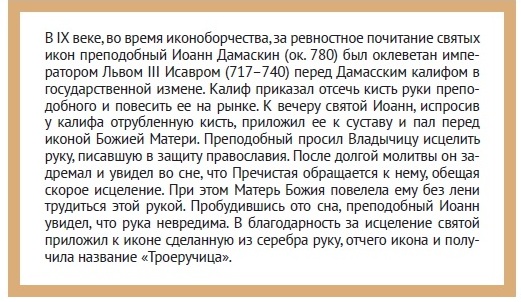 Василий Борисов говорил, что он резал тростник возле родника. Устал, пошел к воде попить. Видит – вода расступилась и из нее выходит яркая икона Божией Матери. При виде Троеручицы Василий взмолился: «Матушка Владычица, дайся мне», но вода вновь забурлила и скрыла икону.