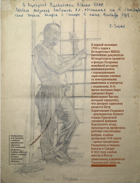 В первой половине 1920-х годов в Истпартотдел ВКП(б) (коллекция документов Истпартотдела хранится в фондах Госархива новейшей истории) поступил альбом с карандашными зарисовками узников за повседневными занятиями и портреты с подписями. В то время научным бюро заведовал Борис Николаевич Чистов, который определил, что автором зарисовок является Петр Харитонович Гладышев – руководитель боевого отряда Гурьевской суконной фабрики Карсунского уезда, председатель профсоюза рабочих текстильных фабрик. Альбом датирован 1918 годом – время заключения Гладышева в тюрьме Комуча в Самаре.