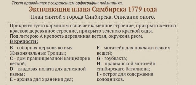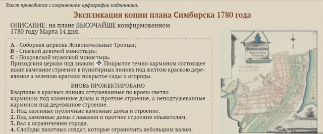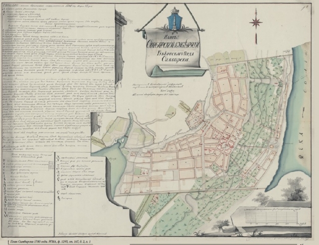 В Российском государственном историческом архиве (РГИА) находится цветная копия плана города Симбирска 1780 года, выполненного в масштабе 100 саженей в дюйме, на котором «Всевысочайшая конфирмация» императрицы Екатерины II: «Быть посему». Копировал с подлинника самарский уездный землемер Бурцов.