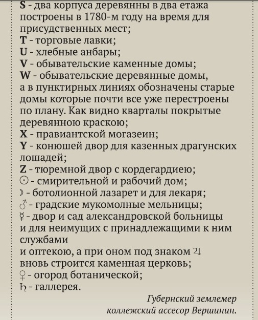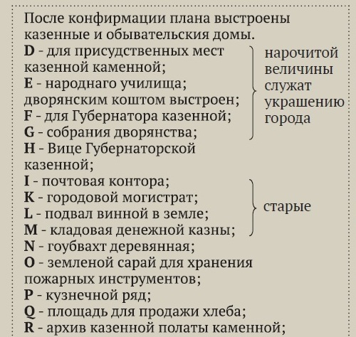 Построение соленных и винных могозеин и кладовых анбаров для поклажи хлебных припасов пеньки и протчих сему подобных товаров для сальных и купоросных кожевенных и протчих заводов естли оные потребны будут для питейных домов скотских боен для кузниц и для других градских казенных и публичных строениев место назначить Господину правящему должность Господина Генерал Губернатора где по пристойности способнее усмотрено будет чтоб для безопасности от жила деревяннаго строения построены были в нарочитом разстоянии могазеины и анбары поблизости рек кожевенные и протчие заводы и скотские боины по течение рек ниже города в таких местах дабы от них в город не происходило нечистоты и дурнаго воздуха. Пивоварни при реках выше скотских боен и тех заводов от коих происходит нечистота кузницы у больших дорог при въездах в город и все сии строения строить в таком разстоянии от жила чтоб не угрожали опасности от пожара кровли крыть на каменных железом или черепицею а доколе черепичные заводы размножатся тесом и гонтом, на деревянных строениях тесом и гонтом же а дранью хворостом и соломою крыть не допускать у которых обывателей нынешне строение не придет в линии оставить до такого время когда сами собою обветшают повалятся и другим каким случаем уничтожатся или хозяева сами добровольно и прежде того перестроить по плану пожелают дабы обыватели не притерпели убытка от сломий дворов еще к житию годных а у которых дворовые места разделять будут улицы и площади затем на старых местах строить не могут в таком случае сим обывателям отводить другие порожние места под каменные или деревянные домы где б каждой по своему состоянию построить мог. По обветшанию и по уничтожению сих нынешних строений а прежние и разделяющие улицами и площадьми места приводить к соседним дворам как способнее покажется.