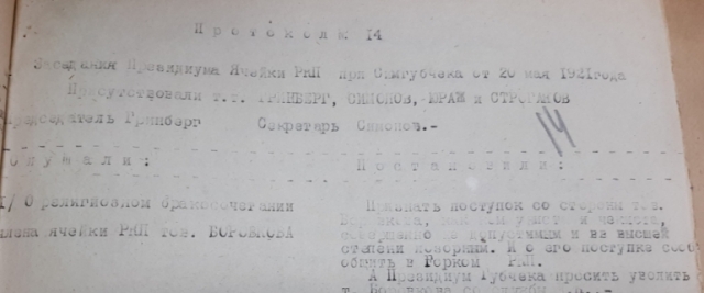 Семейно-революционная драма из госархива новейшей истории: в 1921 году чекиста Боровкова уволили за венчание в церкви, и его жене пришлось написать в партячейку Симгубчека два заявления, объясняющих, что от программы коммунистической партии он отступил ради любимого человека.