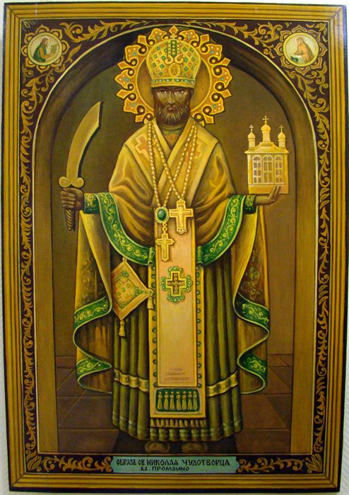 «Икона св. Николая, в Промзине, высечена на камне (барельефом). Фигура святителя выпуклая…». «Она имеет длину около полутора аршина, в ширину около одного аршина (примерно 106х71 см. – Авт.)». Кроме того, сообщалось, что икона была необычайно богато украшена: «В 1875 году была сделана новая, чистого серебра, чеканной работы позлащенная риза на явленную икону Св. Николая Чудотворца. В ней серебра 1 пуд, 20 фунтов и 3 золотника, кроме того до 11,800 штук французских страз, коими усыпана митра и облачение св. Угодника. Стоит риза 4,576 руб. 87 коп.».
