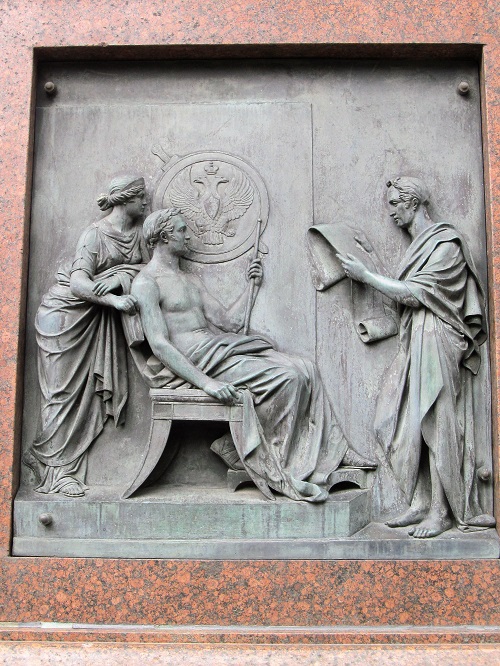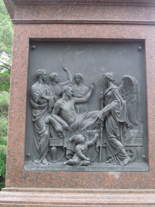 Южный горельеф памятника, запечатлевший Николая Михайловича на смертном одре, ваял скульптор Николай Алексеевич Рамазанов (1817 – 1867), отметившийся рельефами на постаменте памятника Николаю I на Исаакиевской площади в Санкт-Петербурге. Теперь герой – Карамзин, и потому он обнажён и расположился на ложе. Император Николай I горячо сочувствовал больному историку. Он готов был снарядить корабль, чтобы отправить его на лечение в Италию, распорядился выдать ему единовременно 50 000 рублей – например, Симбирский губернатор получал всего-то 3000 в год – и установил ежегодный пенсион для несовершеннолетних детей историографа: он был многодетным отцом, и шестеро детей от двадцати до пяти лет претендовали на царские щедроты.